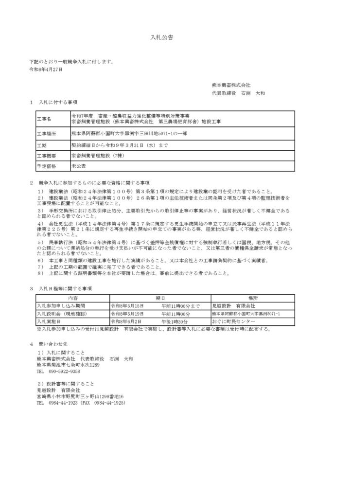 新農場建設(畜産)に伴う入札公告のお知らせ 2026.04.27 News ー地域・社会への持続的な価値創出を目指してー 新農場建設(畜産)に伴う入札公告 ※本公告の内容は予告なく変更となる場合あります。※審査結果におよび選定理由に関する個別のお問い合わせにはお答えいたしかねます。 新着情報一覧へ